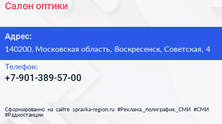 Салон оптики по адресу 140200, Московская область, Воскресенск, Советская, 4 в дальнейшем Организация, размещена в следующих категориях:
