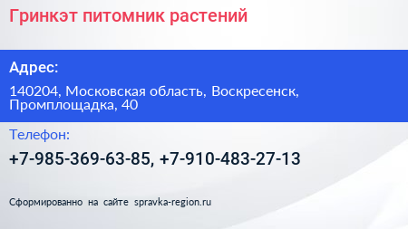 Гринкэт, питомник растений по адресу 140204, Московская область, Воскресенск, Промплощадка, 40 в дальнейшем Организация, размещена в следующих категориях: