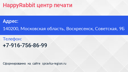HappyRabbit, центр печати по адресу 140200, Московская область, Воскресенск, Советская, 9Б в дальнейшем Организация, размещена в следующих категориях: