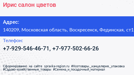 Ирис, салон цветов по адресу 140209, Московская область, Воскресенск, Фединская, ст1 в дальнейшем Организация, размещена в следующих категориях: