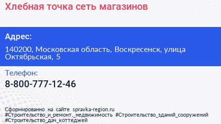 Хлебная точка, сеть магазинов по адресу 140200, Московская область, Воскресенск, улица Октябрьская, 5 в дальнейшем Организация, размещена в следующих категориях: