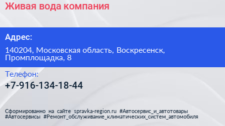 Живая вода, компания по адресу 140204, Московская область, Воскресенск, Промплощадка, 8 в дальнейшем Организация, размещена в следующих категориях:
