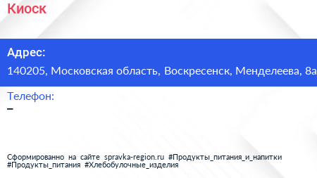 Киоск по адресу 140205, Московская область, Воскресенск, Менделеева, 8а в дальнейшем Организация, размещена в следующих категориях: