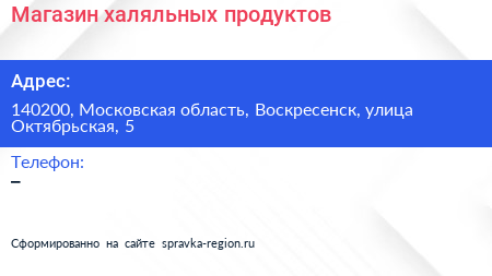 Магазин халяльных продуктов по адресу 140200, Московская область, Воскресенск, улица Октябрьская, 5 в дальнейшем Организация, размещена в следующих категориях: