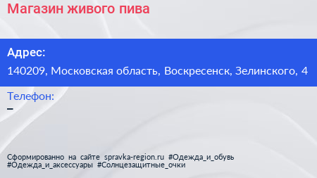 Магазин живого пива по адресу 140209, Московская область, Воскресенск, Зелинского, 4 в дальнейшем Организация, размещена в следующих категориях: