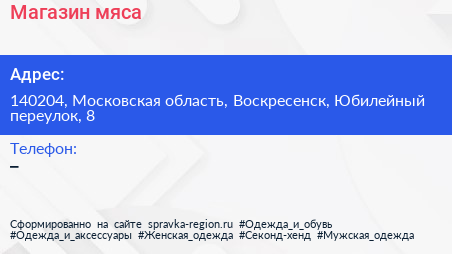 Магазин мяса по адресу 140204, Московская область, Воскресенск, Юбилейный переулок, 8 в дальнейшем Организация, размещена в следующих категориях: