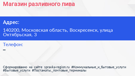 Магазин разливного пива по адресу 140200, Московская область, Воскресенск, улица Октябрьская, 3 в дальнейшем Организация, размещена в следующих категориях: