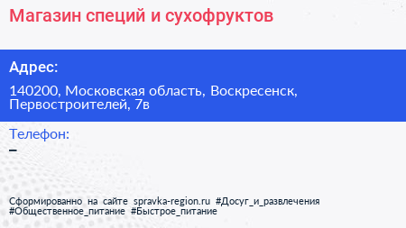 Магазин специй и сухофруктов по адресу 140200, Московская область, Воскресенск, Первостроителей, 7в в дальнейшем Организация, размещена в следующих категориях: