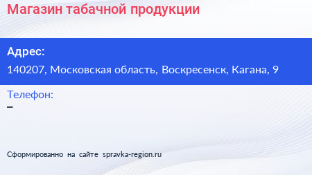 Магазин табачной продукции по адресу 140207, Московская область, Воскресенск, Кагана, 9 в дальнейшем Организация, размещена в следующих категориях: