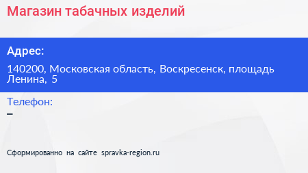 Магазин табачных изделий по адресу 140200, Московская область, Воскресенск, площадь Ленина, 5 в дальнейшем Организация, размещена в следующих категориях: