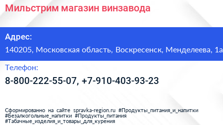 Мильстрим, магазин винзавода по адресу 140205, Московская область, Воскресенск, Менделеева, 1а в дальнейшем Организация, размещена в следующих категориях: