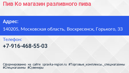 Пив`Ко, магазин разливного пива по адресу 140205, Московская область, Воскресенск, Горького, 33 в дальнейшем Организация, размещена в следующих категориях: