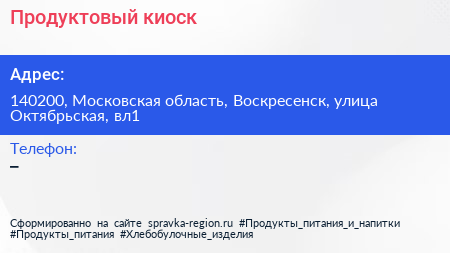 Продуктовый киоск по адресу 140200, Московская область, Воскресенск, улица Октябрьская, вл1 в дальнейшем Организация, размещена в следующих категориях: