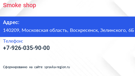 Smoke shop по адресу 140209, Московская область, Воскресенск, Зелинского, 6Б в дальнейшем Организация, размещена в следующих категориях: