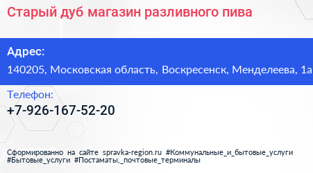 Старый дуб, магазин разливного пива по адресу 140205, Московская область, Воскресенск, Менделеева, 1а в дальнейшем Организация, размещена в следующих категориях: