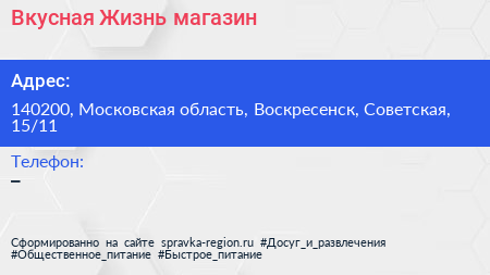Вкусная Жизнь, магазин по адресу 140200, Московская область, Воскресенск, Советская, 15/11 в дальнейшем Организация, размещена в следующих категориях: