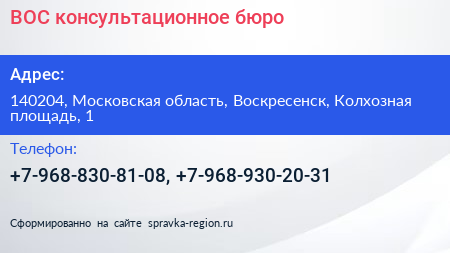 ВОС, консультационное бюро по адресу 140204, Московская область, Воскресенск, Колхозная площадь, 1 в дальнейшем Организация, размещена в следующих категориях: