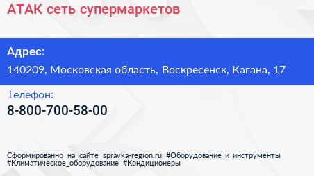 АТАК, сеть супермаркетов по адресу 140209, Московская область, Воскресенск, Кагана, 17 в дальнейшем Организация, размещена в следующих категориях: