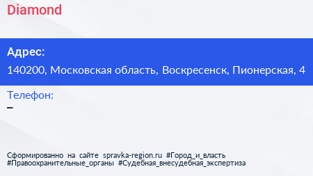 Diamond по адресу 140200, Московская область, Воскресенск, Пионерская, 4 в дальнейшем Организация, размещена в следующих категориях: