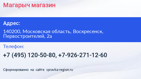 Магарыч, магазин по адресу 140200, Московская область, Воскресенск, Первостроителей, 2а в дальнейшем Организация, размещена в следующих категориях: