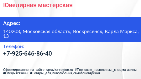 Ювелирная мастерская по адресу 140203, Московская область, Воскресенск, Карла Маркса, 13 в дальнейшем Организация, размещена в следующих категориях: