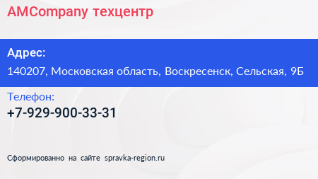 AMCompany, техцентр по адресу 140207, Московская область, Воскресенск, Сельская, 9Б в дальнейшем Организация, размещена в следующих категориях: