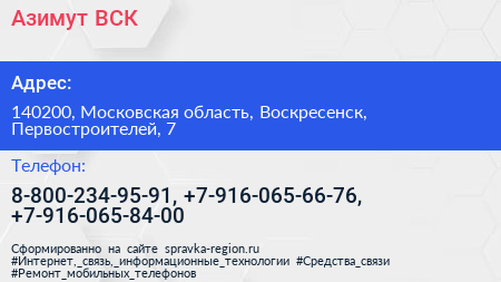 Азимут-ВСК по адресу 140200, Московская область, Воскресенск, Первостроителей, 7 в дальнейшем Организация, размещена в следующих категориях: