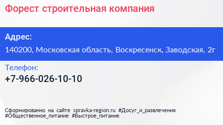 Форест, строительная компания по адресу 140200, Московская область, Воскресенск, Заводская, 2г в дальнейшем Организация, размещена в следующих категориях:
