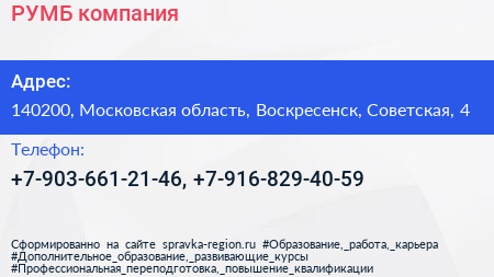 РУМБ, компания по адресу 140200, Московская область, Воскресенск, Советская, 4 в дальнейшем Организация, размещена в следующих категориях: