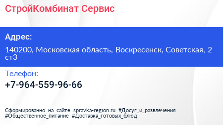 СтройКомбинат-Сервис по адресу 140200, Московская область, Воскресенск, Советская, 2 ст3 в дальнейшем Организация, размещена в следующих категориях: