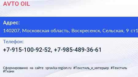 AVTO OIL по адресу 140207, Московская область, Воскресенск, Сельская, 9 ст1 в дальнейшем Организация, размещена в следующих категориях: