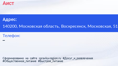 Аист по адресу 140200, Московская область, Воскресенск, Московская, 51 в дальнейшем Организация, размещена в следующих категориях: