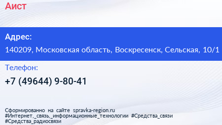Аист по адресу 140209, Московская область, Воскресенск, Сельская, 10/1 в дальнейшем Организация, размещена в следующих категориях: