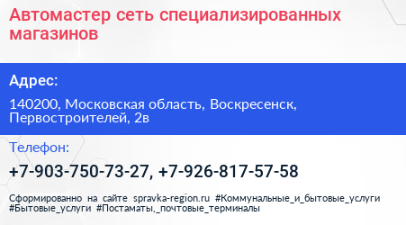 Автомастер, сеть специализированных магазинов по адресу 140200, Московская область, Воскресенск, Первостроителей, 2в в дальнейшем Организация, размещена в следующих категориях:
