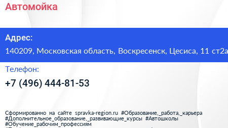 Автомойка по адресу 140209, Московская область, Воскресенск, Цесиса, 11 ст2а в дальнейшем Организация, размещена в следующих категориях: