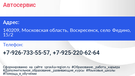 Автосервис по адресу 140209, Московская область, Воскресенск, село Федино, 15/2 в дальнейшем Организация, размещена в следующих категориях: