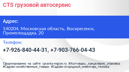 CTS, грузовой автосервис по адресу 140204, Московская область, Воскресенск, Промплощадка, 20 в дальнейшем Организация, размещена в следующих категориях: