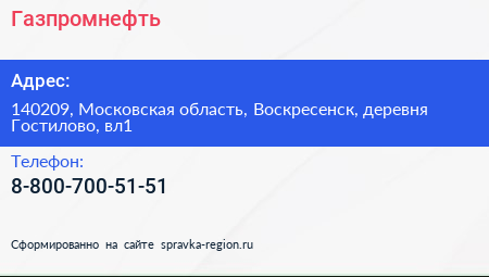 Газпромнефть по адресу 140209, Московская область, Воскресенск, деревня Гостилово, вл1 в дальнейшем Организация, размещена в следующих категориях: