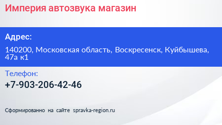 Империя автозвука, магазин по адресу 140200, Московская область, Воскресенск, Куйбышева, 47а к1 в дальнейшем Организация, размещена в следующих категориях: