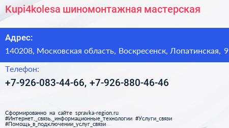 Kupi4kolesa, шиномонтажная мастерская по адресу 140208, Московская область, Воскресенск, Лопатинская, 9 в дальнейшем Организация, размещена в следующих категориях: