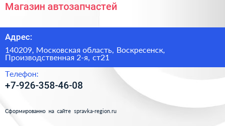 Магазин автозапчастей по адресу 140209, Московская область, Воскресенск, Производственная 2-я, ст21 в дальнейшем Организация, размещена в следующих категориях: