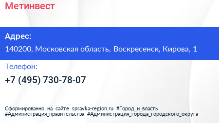Метинвест по адресу 140200, Московская область, Воскресенск, Кирова, 1 в дальнейшем Организация, размещена в следующих категориях: