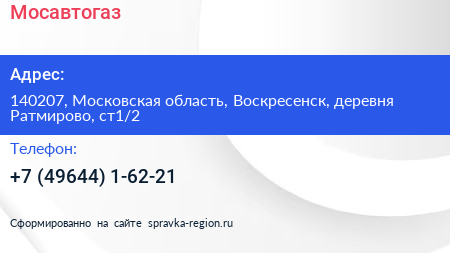 Мосавтогаз по адресу 140207, Московская область, Воскресенск, деревня Ратмирово, ст1/2 в дальнейшем Организация, размещена в следующих категориях: