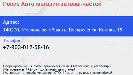 Ронис-Авто, магазин автозапчастей по адресу 140200, Московская область, Воскресенск, Конная, 19 в дальнейшем Организация, размещена в следующих категориях: