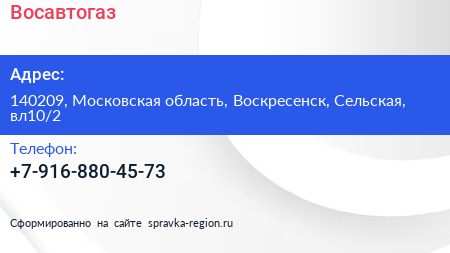 Восавтогаз по адресу 140209, Московская область, Воскресенск, Сельская, вл10/2 в дальнейшем Организация, размещена в следующих категориях: