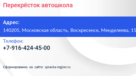Перекрёсток, автошкола по адресу 140205, Московская область, Воскресенск, Менделеева, 15 в дальнейшем Организация, размещена в следующих категориях:
