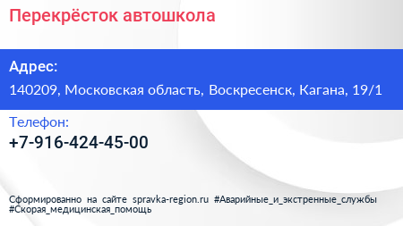 Перекрёсток, автошкола по адресу 140209, Московская область, Воскресенск, Кагана, 19/1 в дальнейшем Организация, размещена в следующих категориях: