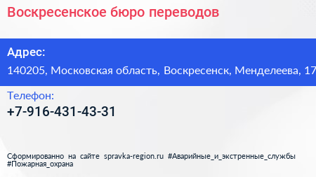 Воскресенское бюро переводов по адресу 140205, Московская область, Воскресенск, Менделеева, 17 в дальнейшем Организация, размещена в следующих категориях: