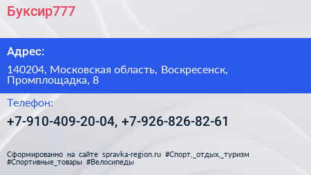 Буксир777 по адресу 140204, Московская область, Воскресенск, Промплощадка, 8 в дальнейшем Организация, размещена в следующих категориях: