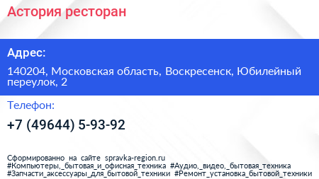 Астория, ресторан по адресу 140204, Московская область, Воскресенск, Юбилейный переулок, 2 в дальнейшем Организация, размещена в следующих категориях: